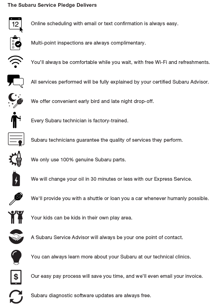 Our goal is to take care of you and keep your Subaru running right. That's where our Subaru Service Pledge comes in - it's our promise to always deliver expert maintenance and repairs while providing excellent customer service.
